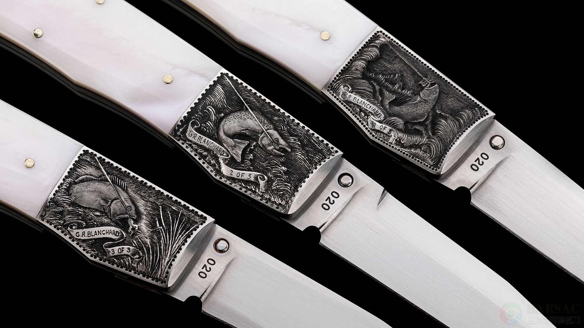 这套溪钓之王共为三把刀套装,刀刃为ATS34不锈钢,精美缎面拉丝处理,笔直细腻。每把不锈钢推钮加线锁设计,有推钮的杰斯款式非常稀少,单手开合手感绝佳,均匀有力。416不锈钢护手,超精美的雕刻由美国大师盖瑞·布兰恰特手工锤雕雕刻而成,分别雕刻了溪钓中凶猛的棕鳟、国王三文鱼、狼鲈鱼,以及大鱼上钩之后与人博弈的画面,高浮雕刻画的细节精湛传神,动感十足。