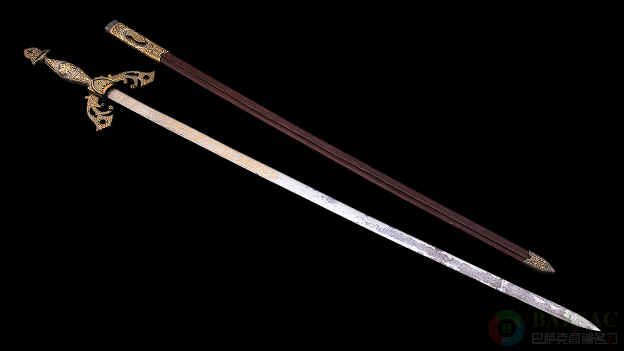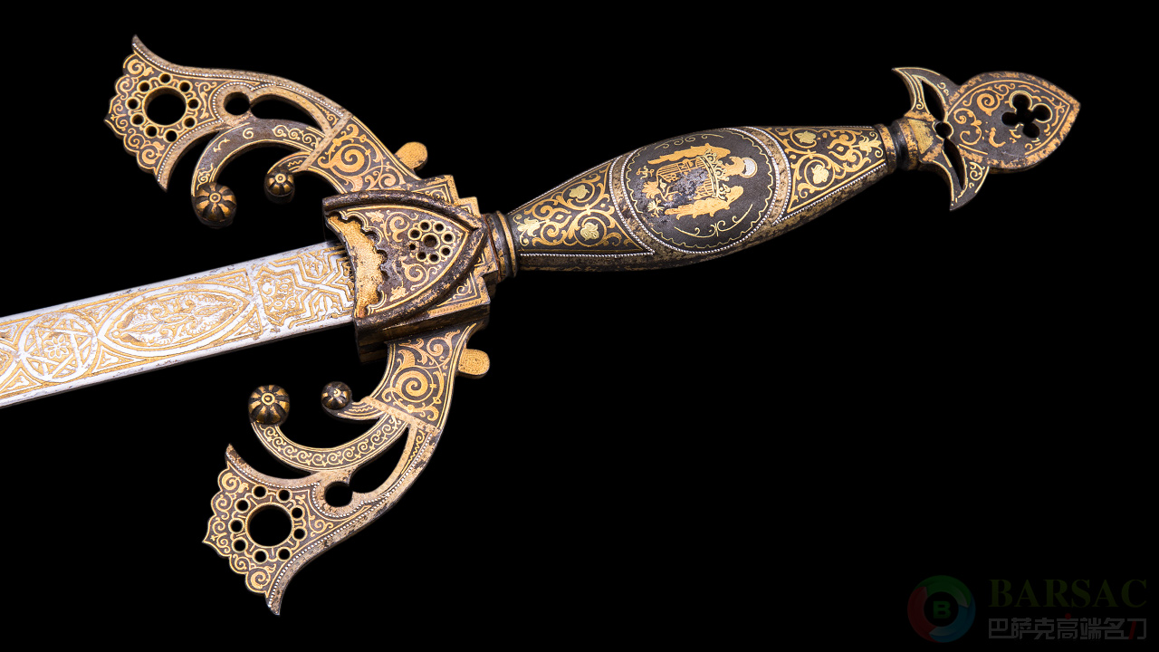 大开门作品,一目了然,18世纪末。其余不说光是这身精美雕刻放在今天也是名家手笔,这么大尺寸的满雕更是价格不菲!提泽纳为西班牙特有形制长剑,其原型为西班牙英雄王熙德所有。熙德的提泽纳如今为西班牙国宝存放在博物馆里,后世有名家制作同类型款式。