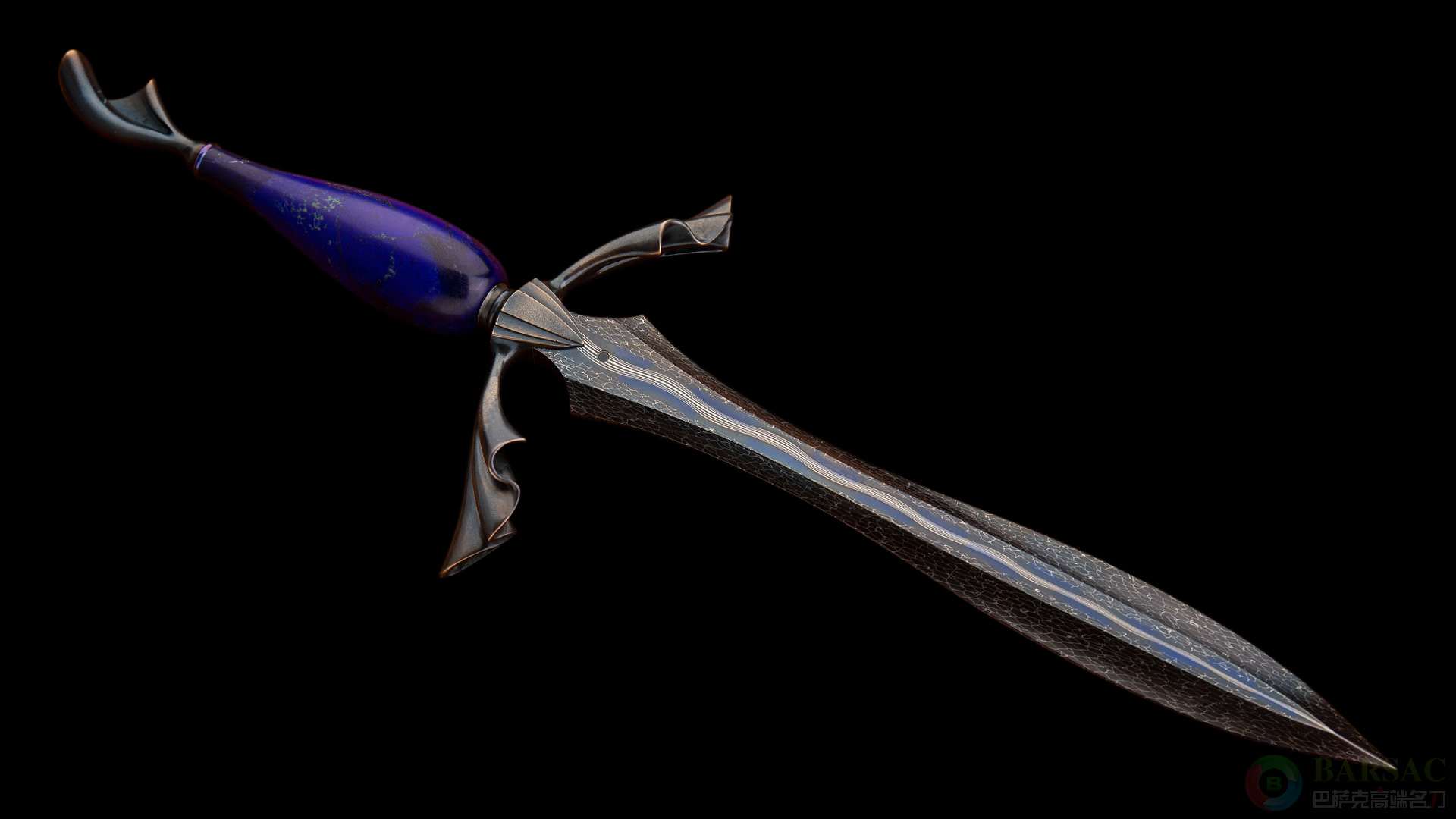 护手与尾铁采用铜制成,潇洒飘逸,如同水中摇摆的鱼尾。剑柄采用青金石制成,线条凹凸有致,握感饱满;青金石的色彩也像是无限的苍穹,与主题意境衔接恰到好处。菲尼斯特外形取材于欧洲古典左手剑,在博蒂杰出的现代技艺加持下,让人过目难忘。