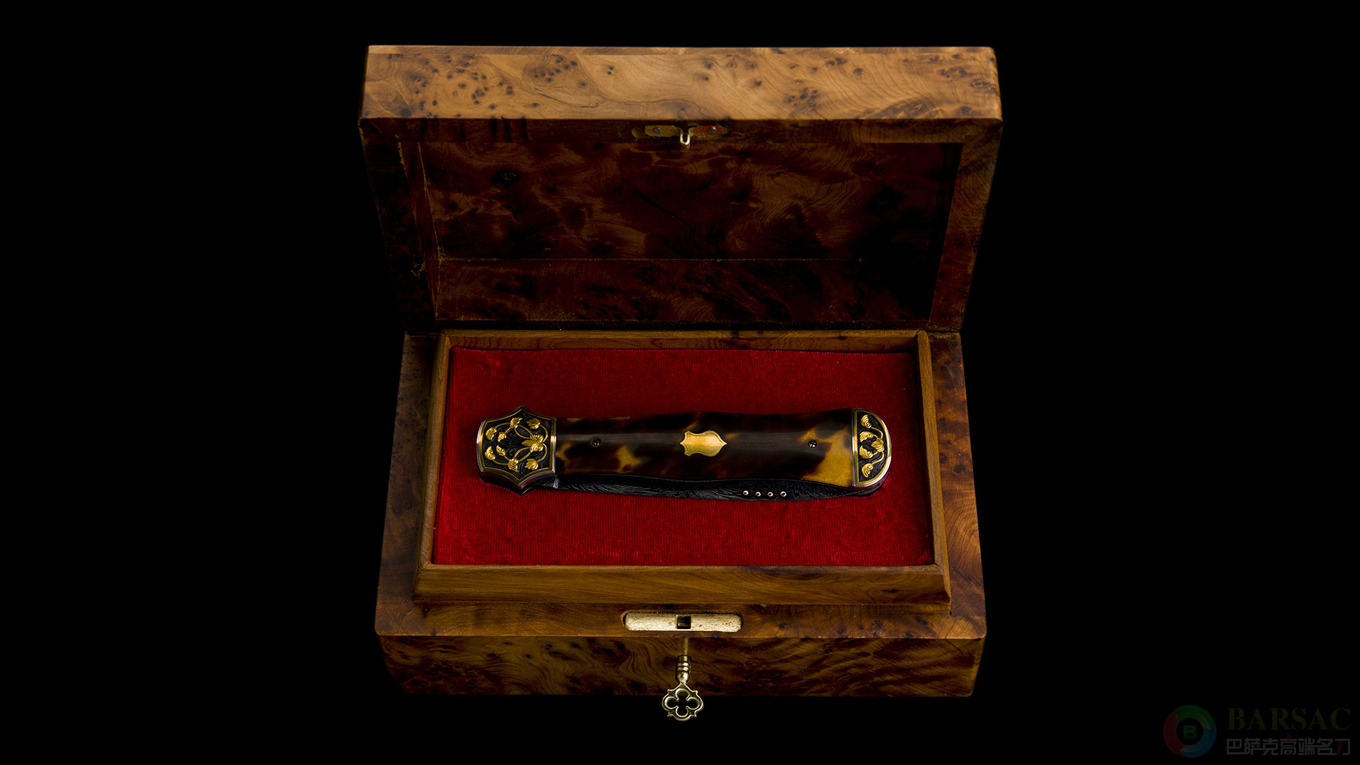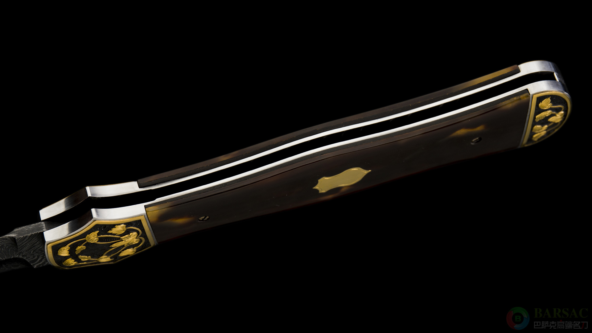刀柄采用416不锈钢以及古董名贵材料制作而成,刀柄中心镶嵌黄金制成的盾形纹章,可以雕刻主人的姓名。刀柄两侧不锈钢区域,哈维展现了他精美的雕工,在2021年拜师美国雕刻大师巴瑞李之后,哈维掌握了其招牌的黄金浮雕卷叶高浮雕技法。