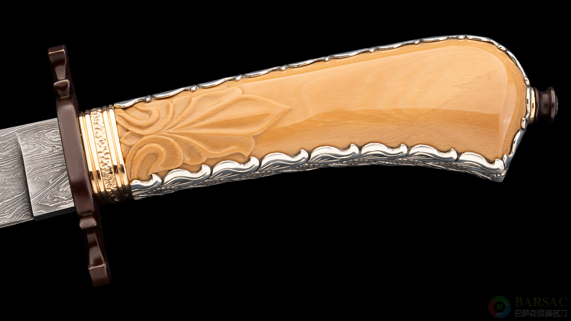 这款仲夏之叶作品刀刃采用拉瑞锻造大马士革制成,花纹细密连贯,动感传神。护手采用高碳钢与14K金制作而成,精美烤蓝色彩的铺垫使得黄金色泽更为闪耀。刀柄选用精品棕色海象牙化石雕刻而成,经典的拉瑞卷叶高浮雕呈现于此,立体生动,简约高雅。
