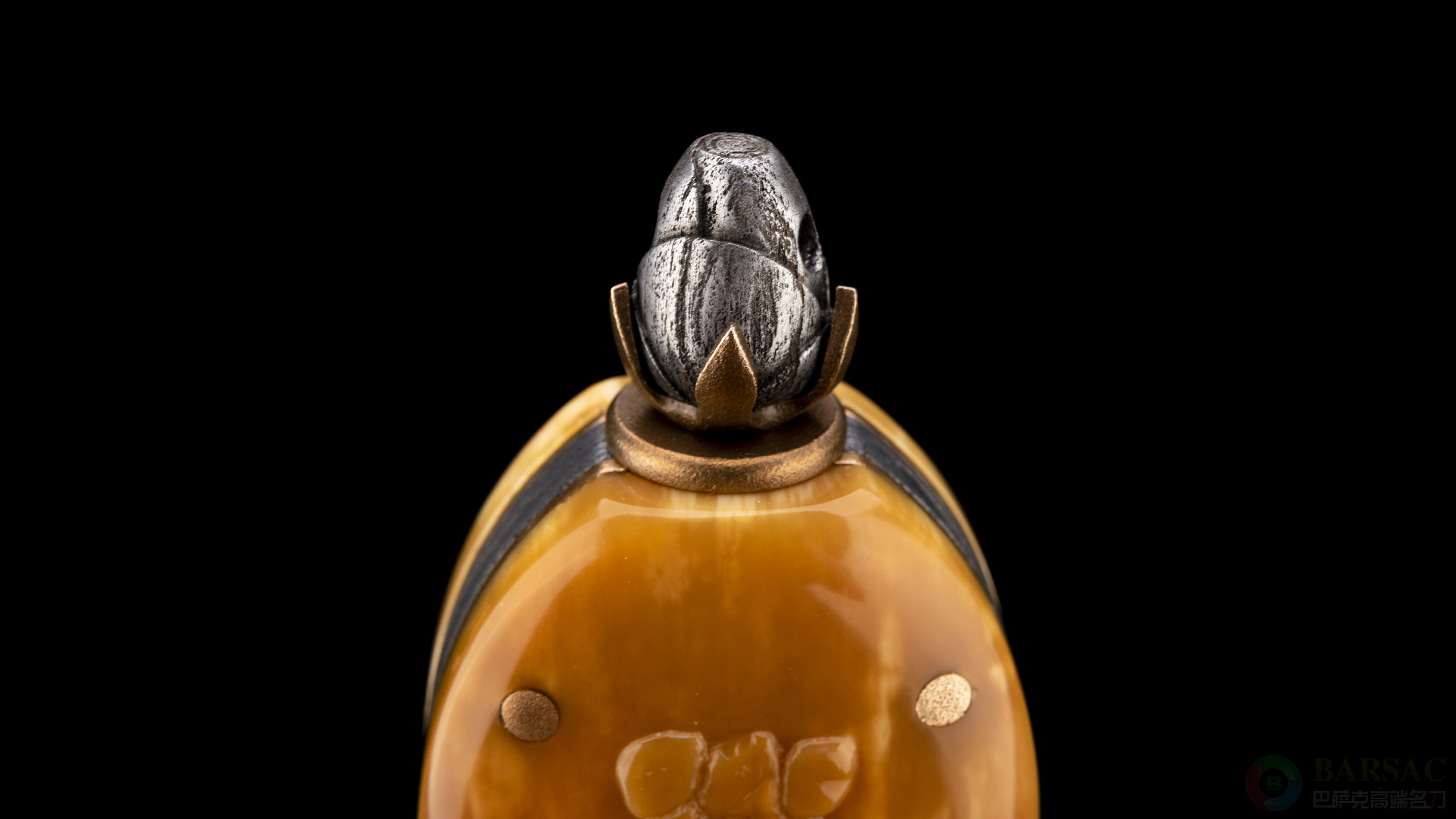刀柄采用极品化石海象牙雕刻而成,一侧雕刻有蝴蝶飞舞,蜂鸟吸蜜的画面;一侧雕刻了通向庭园中心的石板小路。尾部采用铜与大马士革雕刻而成,雕刻成了花朵外形。