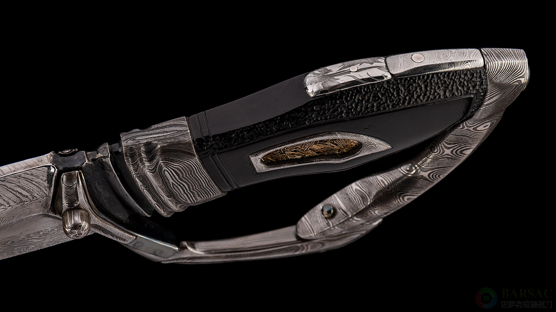 D护手同样由锻打大马制成,整体线条流畅而硬朗,衬托出大马士革花纹的刚健表现力。刀柄采用乌木雕刻而成,中部镶嵌大马士革,并巧妙的运用银丝构建了细密的丝网,这些丝网象征着命运女神正在编织的命运之线,加上适当氧化形成丰富的视觉效果,赋予表达时间的艺术效果来强调命运的永恒。