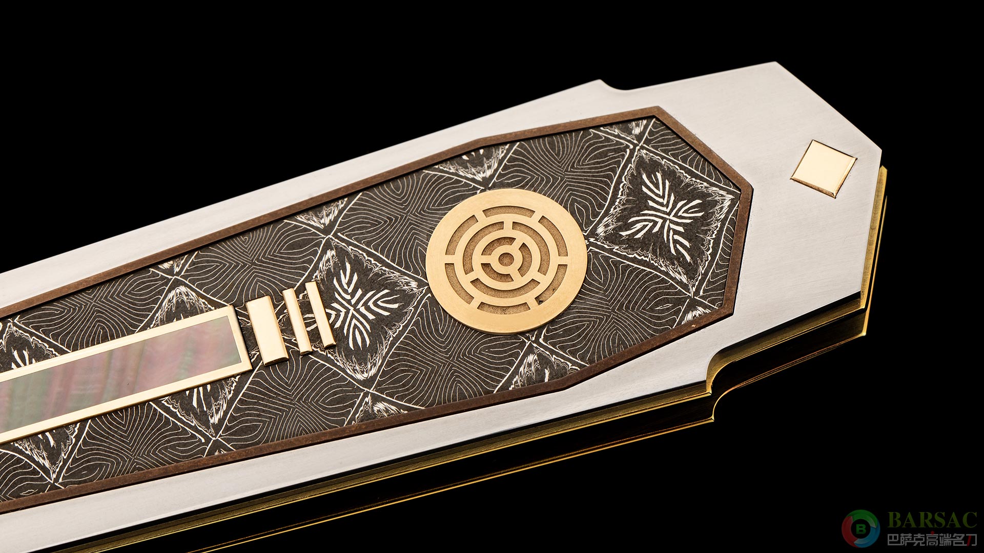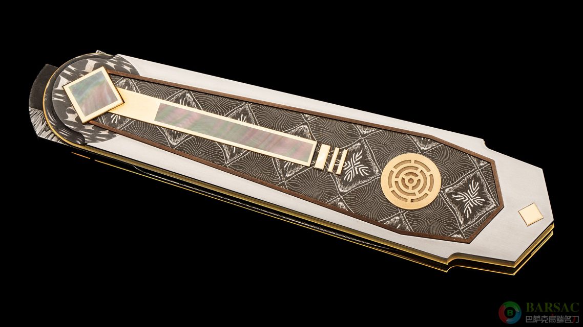 整件作品从外形到细节装饰,如同一只高科技注射器;黑色贝母象征着充满神奇力量的液体,黄金浮雕如同注射器的按钮,与大马士革的箭头花纹更是形成超强的联动效果。亚特兰大为世界上规模最大的刀具展会,能在展会中夺魁最佳折刀大奖的作品,自然属于宝物。