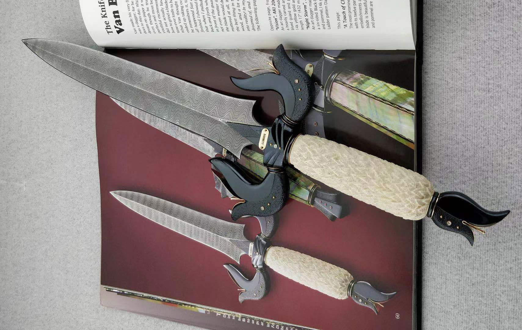 2009年AKI刀展大作,上书佳作,美国AKI大师范·巴尼特精品短剑,孤品唯一。范职业制刀超过35年,除了华贵的艺术刀之外,他还擅长制作朋克风格作品,高端作品高达六位数美金。范获奖众多,包括最佳艺术刀、最佳折刀、克隆克大奖等等,属于艺术刀界大咖级人物。