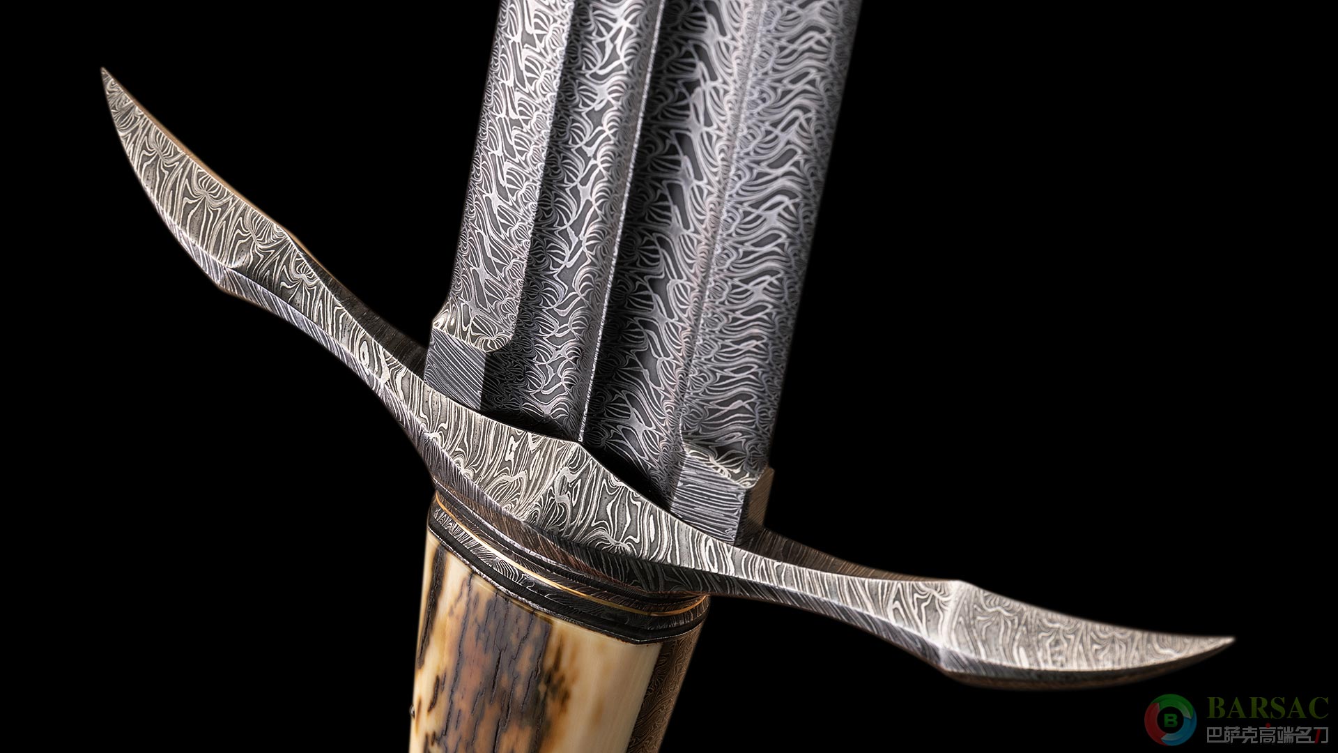 这款女巫猎人作品为朱利安·安图尼斯双大奖作品,该作品获得2016圣保罗最佳大马士革以及最佳艺术刀大奖,时至今日,此件作品无论是设计与细节,仍然是朱利安的绝对佳作。刀刃由粗细不一的螺旋花纹编排成的宏伟星云纹制成,花纹过渡清晰自然,触感平整光滑;剑刃每侧带有大气的剑槽,气势如虹。剑柄采用猛犸牙制成,两边镶嵌黄金环绕。护手与尾铁外形线条极度锐利,外形非常独特,带有如同邪魅一般的迷人气息。剑鞘同样花费大量心血打造,与宝剑细节交相呼应。
