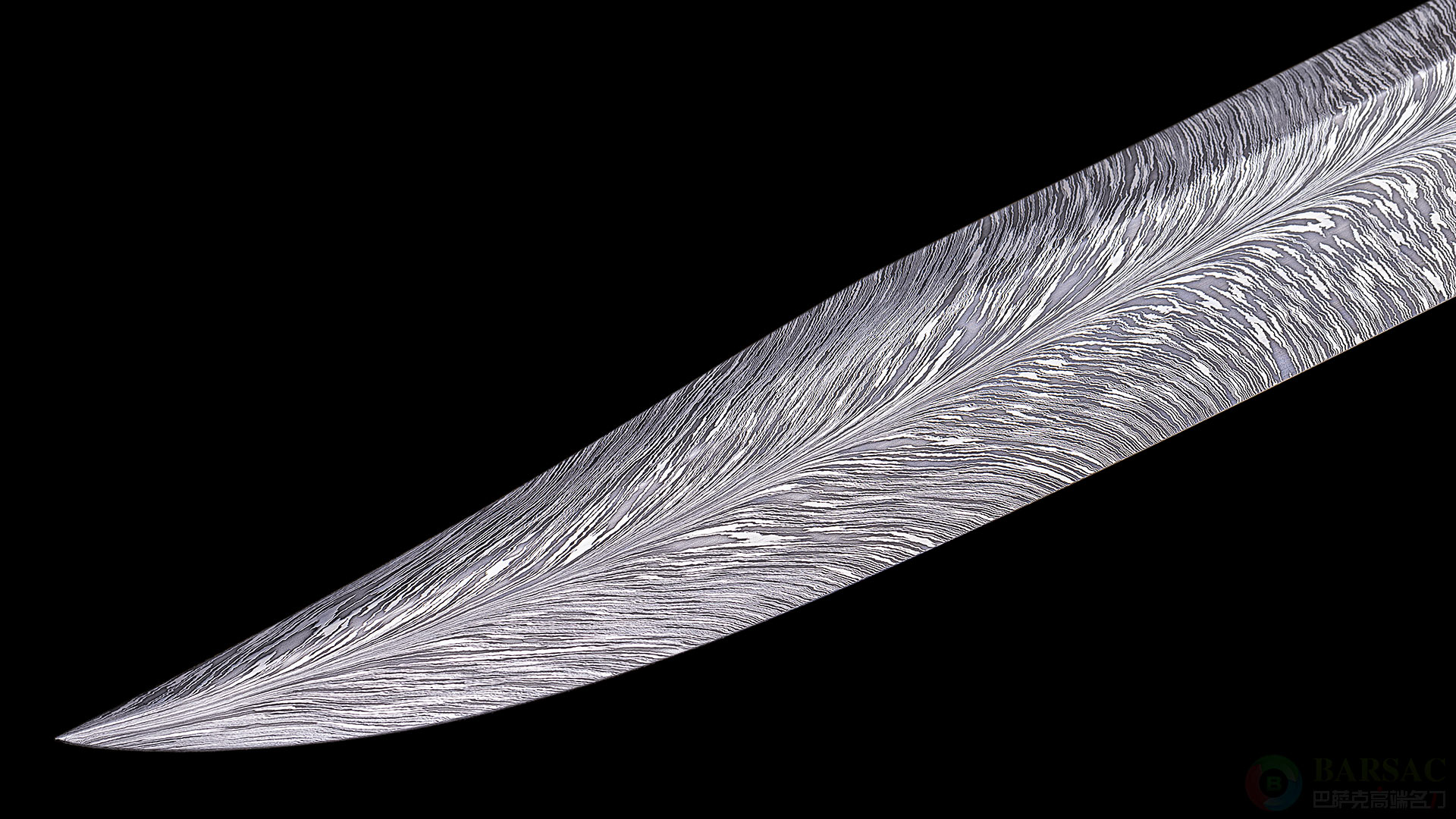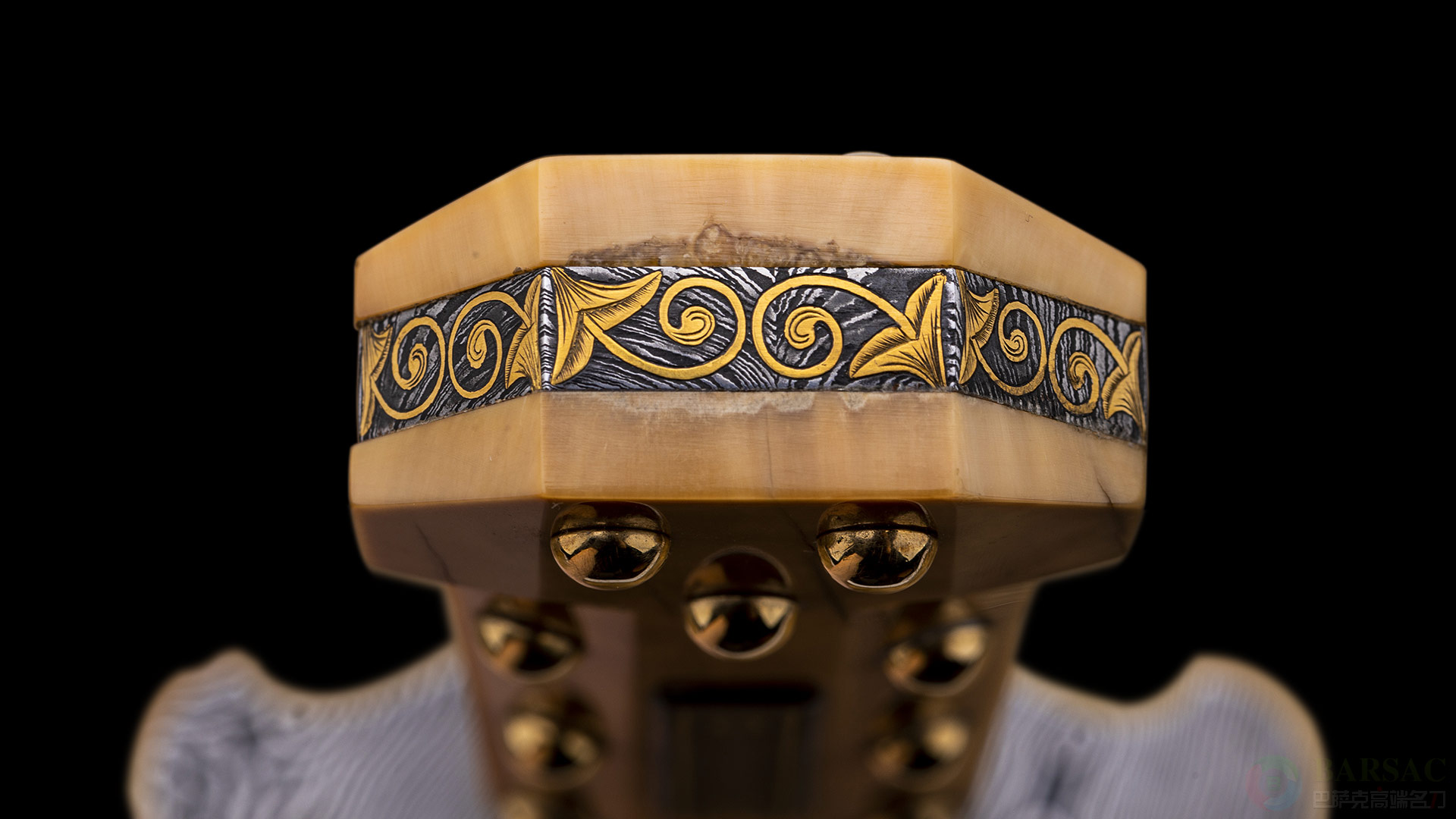 该博伊哈维选择了潇洒的羽毛纹大马士革,花纹非常细腻,在刀身上得到了尽情的舒展,一眼辨识出自大师手笔。刀柄是由极品海象牙化石制成,表面打磨得非常光滑。柄上的铆钉与铆钉罩都是由14K金制作而成,奢华至极。