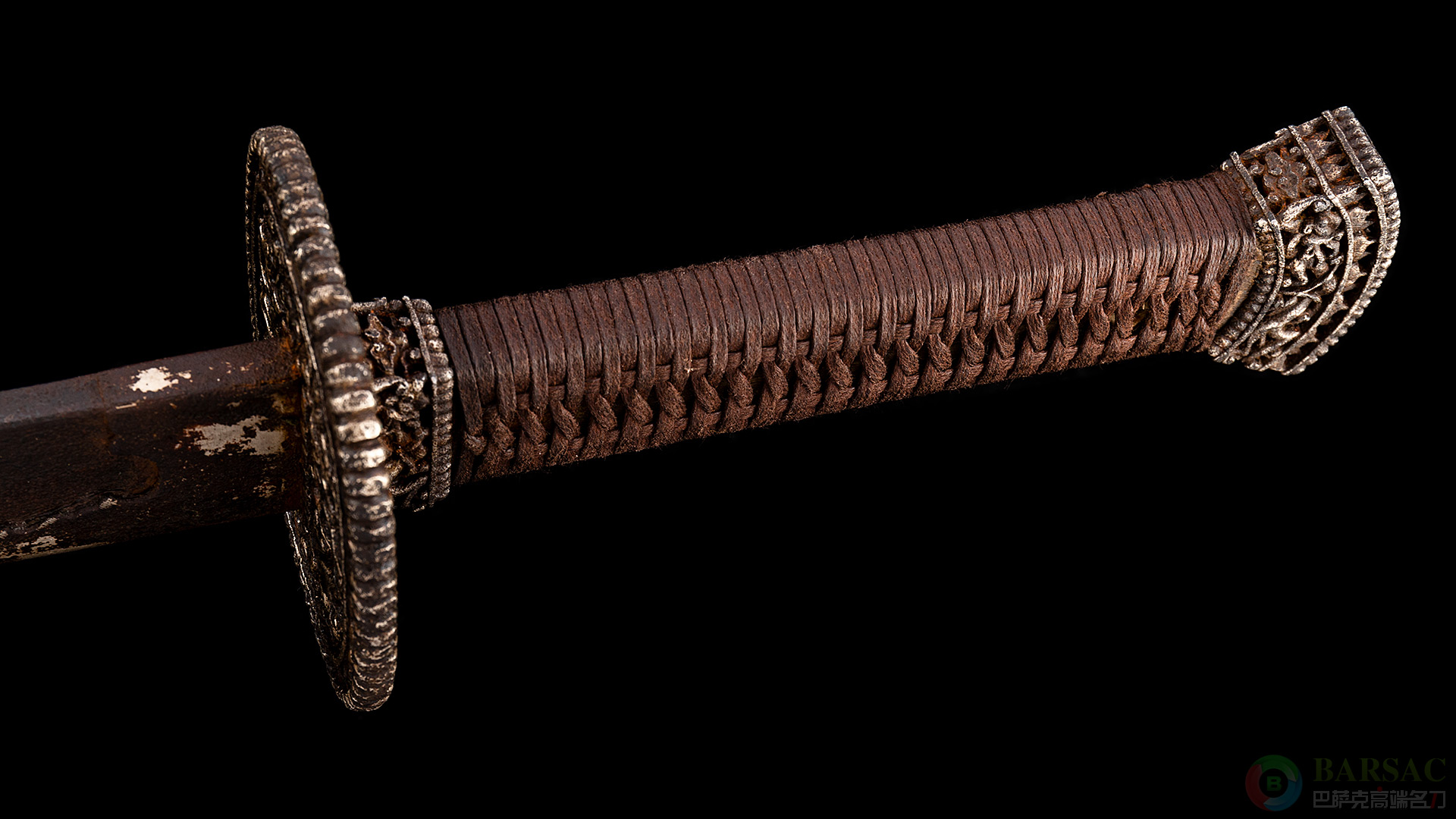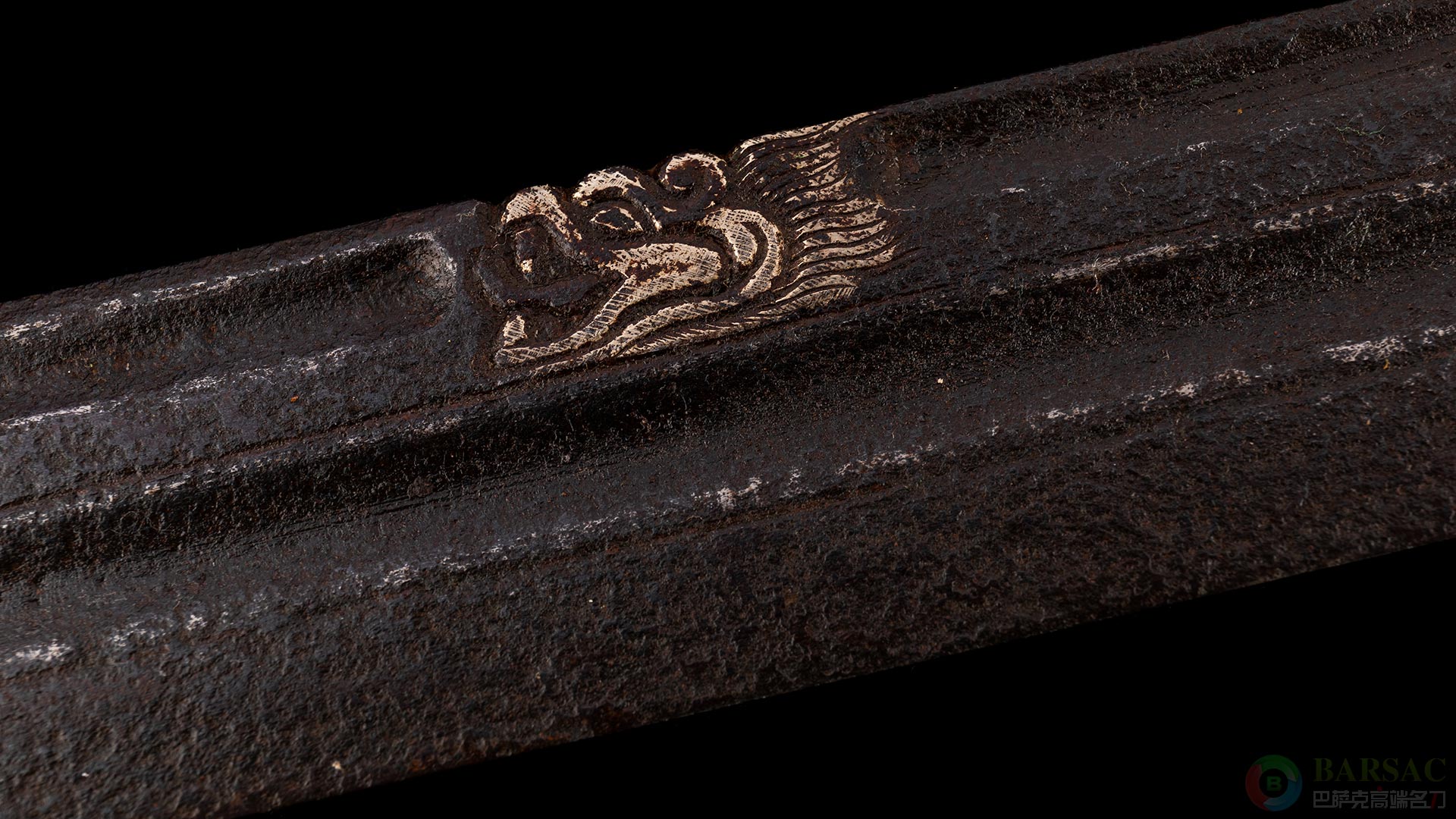 刀的装具全部鎫银,镂空浮雕金龙,刀背浮雕行龙,龙发火焰后飘。清代皇室所用浮雕金龙刀背,皆为此类。整件作品保存完好,包浆老道,是中国古兵珍品级收藏佳选。