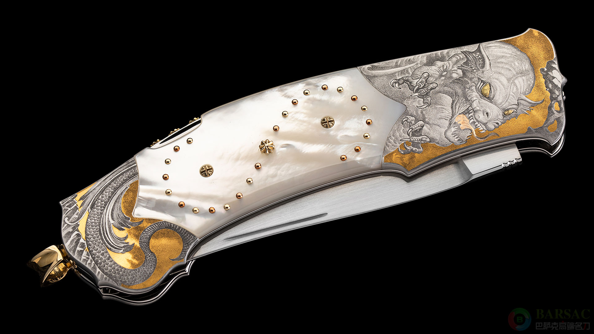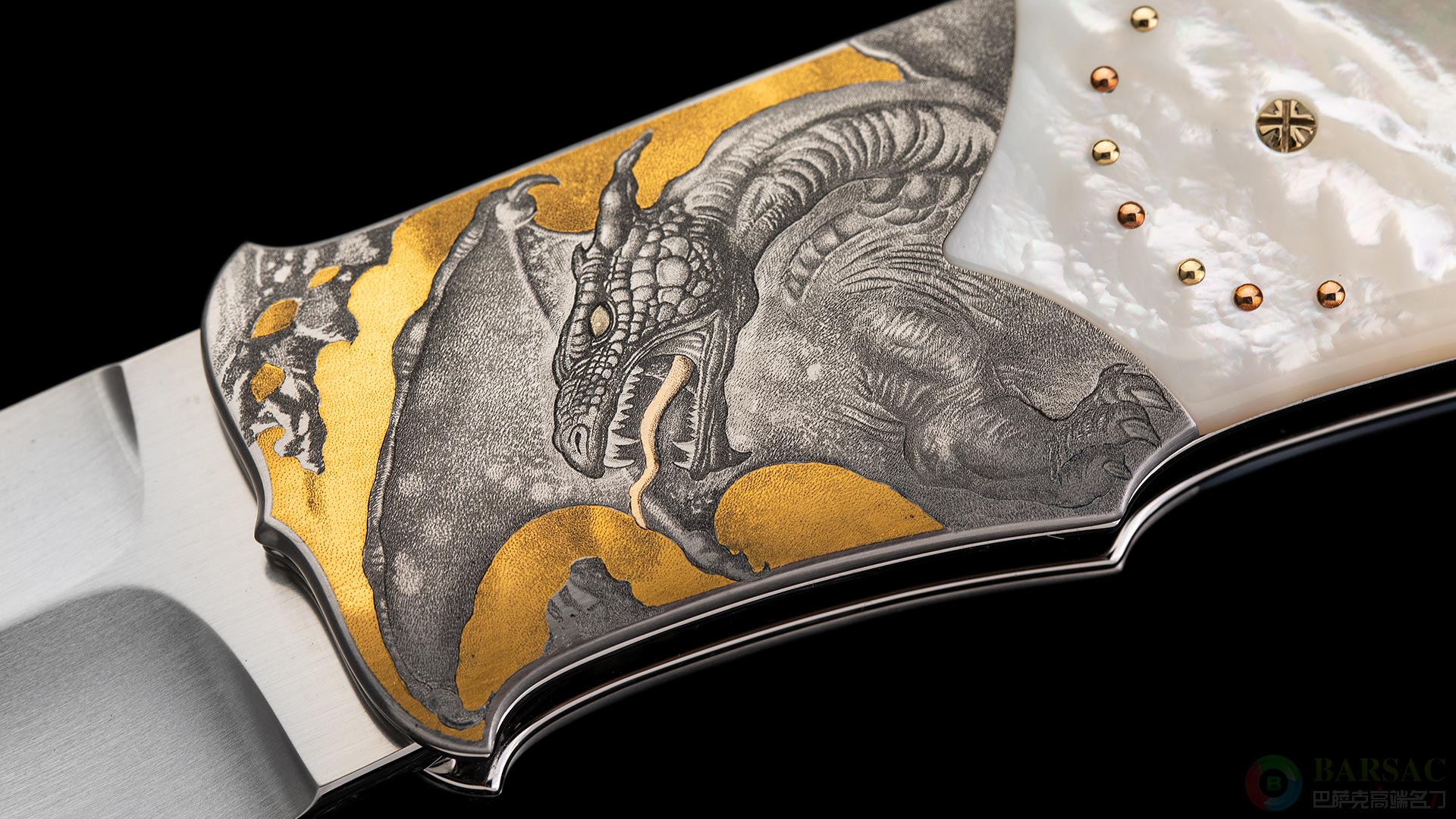 这款恶龙之战作品刀刃采用RWL34不锈钢制作而成,缎面手工拉丝刃面,所有线条向着刀尖汇聚,动感细腻。刀柄采用416不锈钢加精品珍珠贝母制作而成,不锈钢区域展现了意大利影雕的杰出表现力,两条霸气的恶龙在空中缠斗,表情神态、鳞片肌理、肌肉线条在大师深厚的功力之下展现得极其精彩;同时雕刻还用到了18K黄金镶嵌加工,以此来渲染天空、山峦以及海岸线的壮丽美景,龙的烈焰将大气灼烧,巧妙的画面布局将如此宏大的场景缩微在方寸之间。