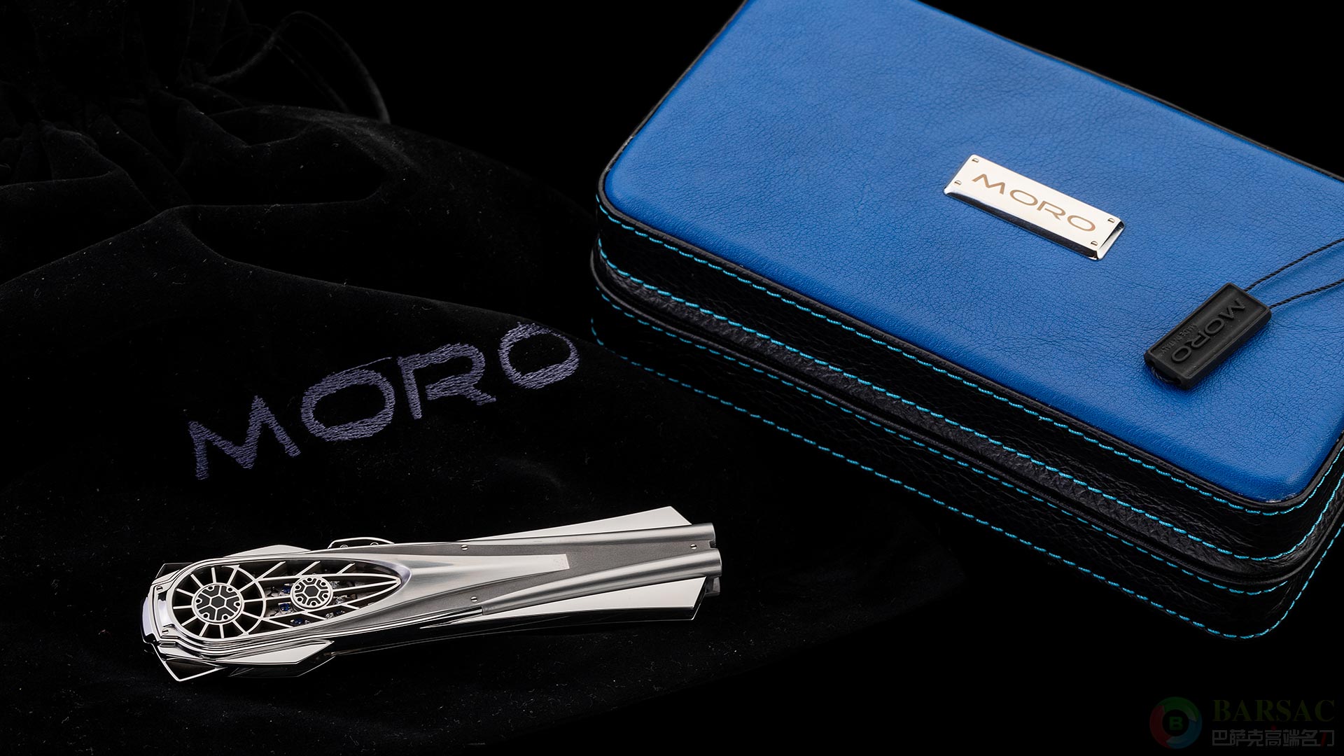 刀柄采用AISI 416不锈钢打造,外形轮廓借鉴了知名跑车帕加尼风神的精髓,展现出十足的时尚外观与爆发力。刀柄尾部如同火箭引擎设计,镶嵌了四枚红宝石装饰,如同被点燃的激情火花,将作品的机械的艺术之美升华到极致。除了作品本身超凡脱俗之外,莫诺还定制了意大利皮革专用刀包,堪称爱马仕品质,为这件精美艺术折刀提供了最佳的包装与保护。