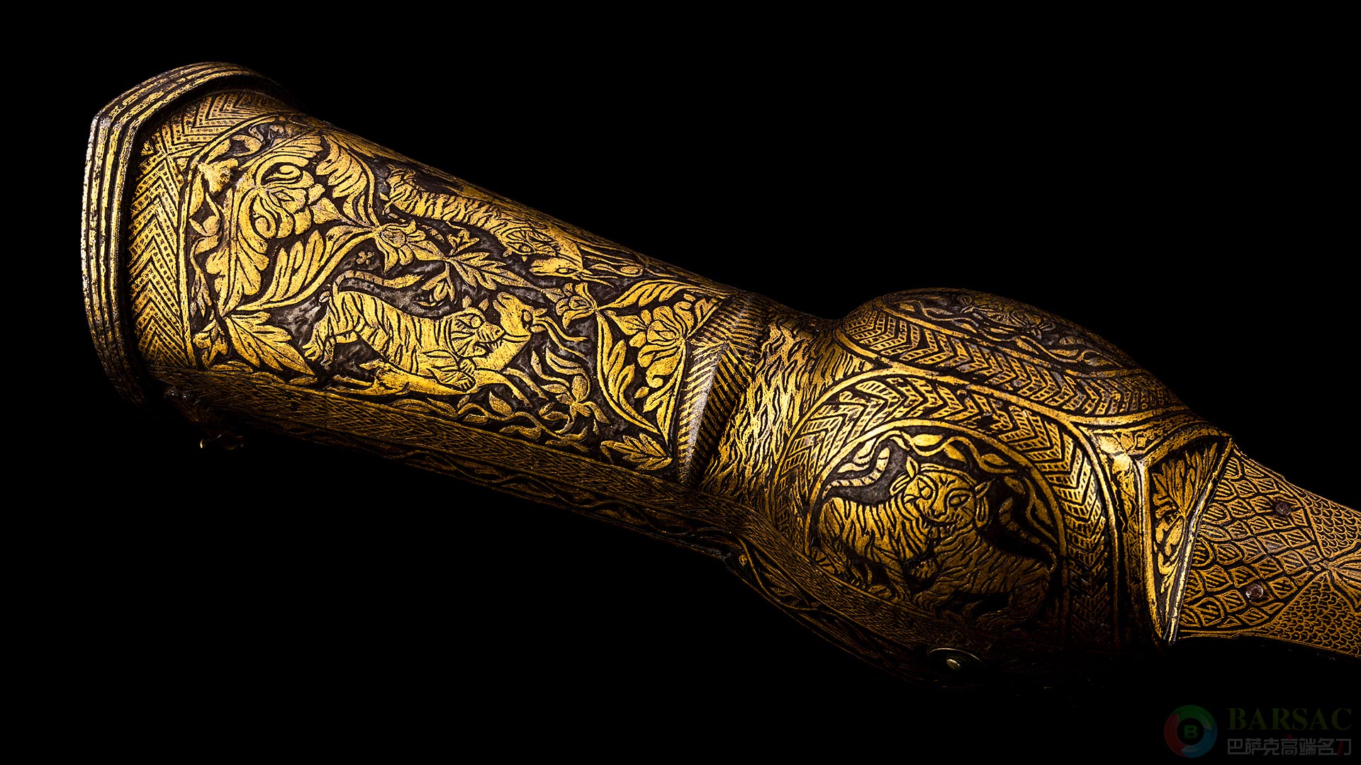 这把帕塔剑全长127厘米,刃长90厘米,重1172克。剑刃为乌兹钢打造而成,带有魔性般色彩的花纹隐隐闪耀着锋芒寒光。铁腕部分表面满浮雕雕刻了西亚风情纹饰与丛林植物图案,并描绘了猛虎狩猎花鹿的动感画面,再采用黄金鋄金装饰,华丽精美,金光灿灿。