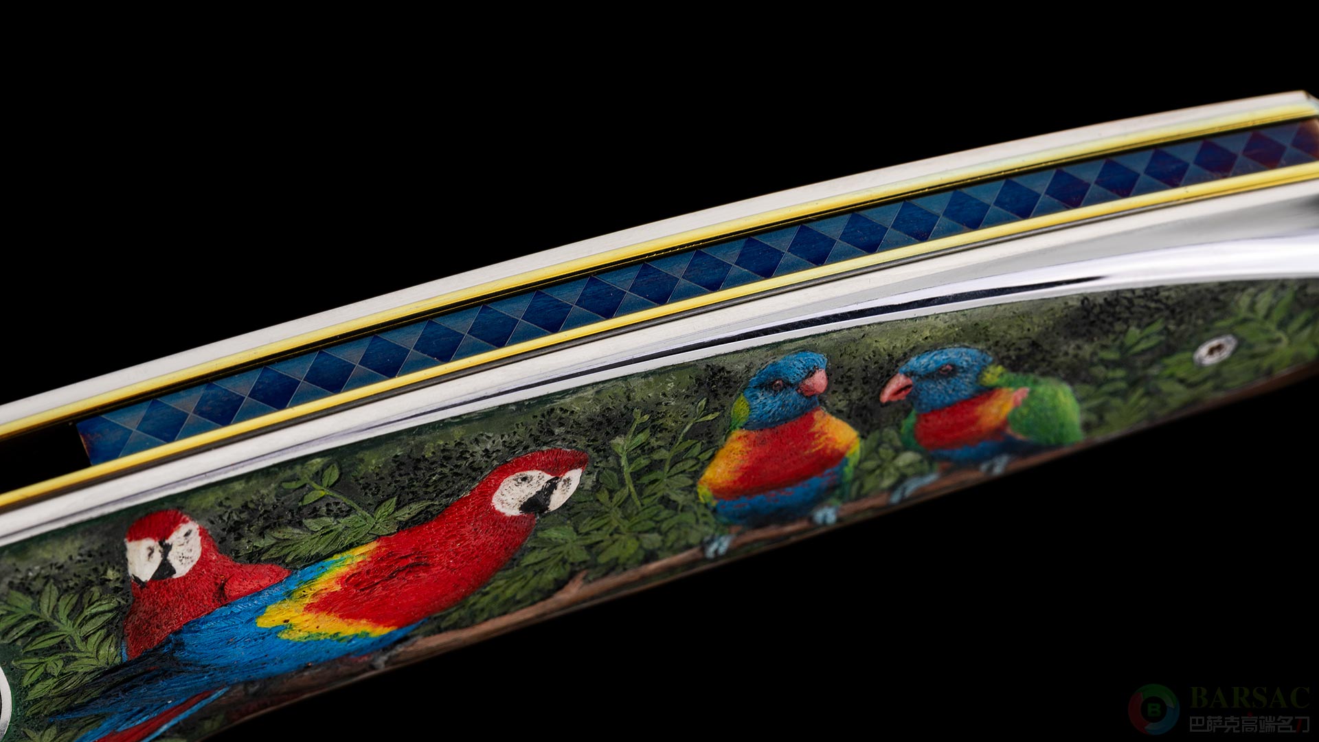 刀柄两侧中部采用珍珠贝母镶嵌,表面彩雕再由意大利雕刻大师马里奥·特兹与路易莎·加纳什合璧完成,马里奥制作了精美的鹦鹉与雨林浮雕;路易莎采用出色的微型彩画工艺,将整幅画面附上写实的色彩,如同一幅让人陶醉的油画。刀柄两侧数种不同的鹦鹉(金刚鹦鹉、吸蜜鹦鹉、葵花鹦鹉)其乐融融地盘踞在树枝之上嬉戏,从表情到动态再到羽毛色彩,还原度极高,充分展现了艺术家的杰出技艺。