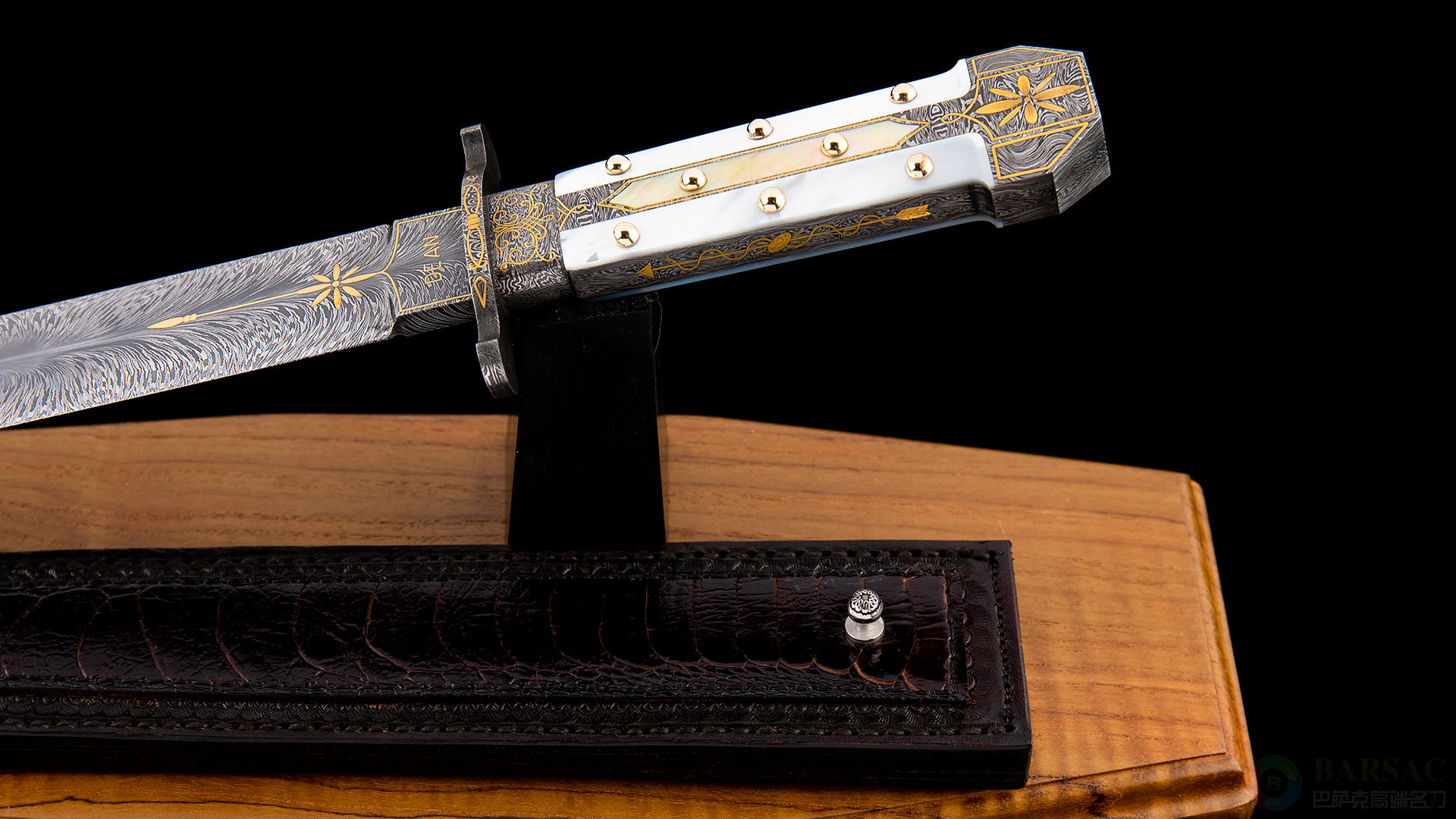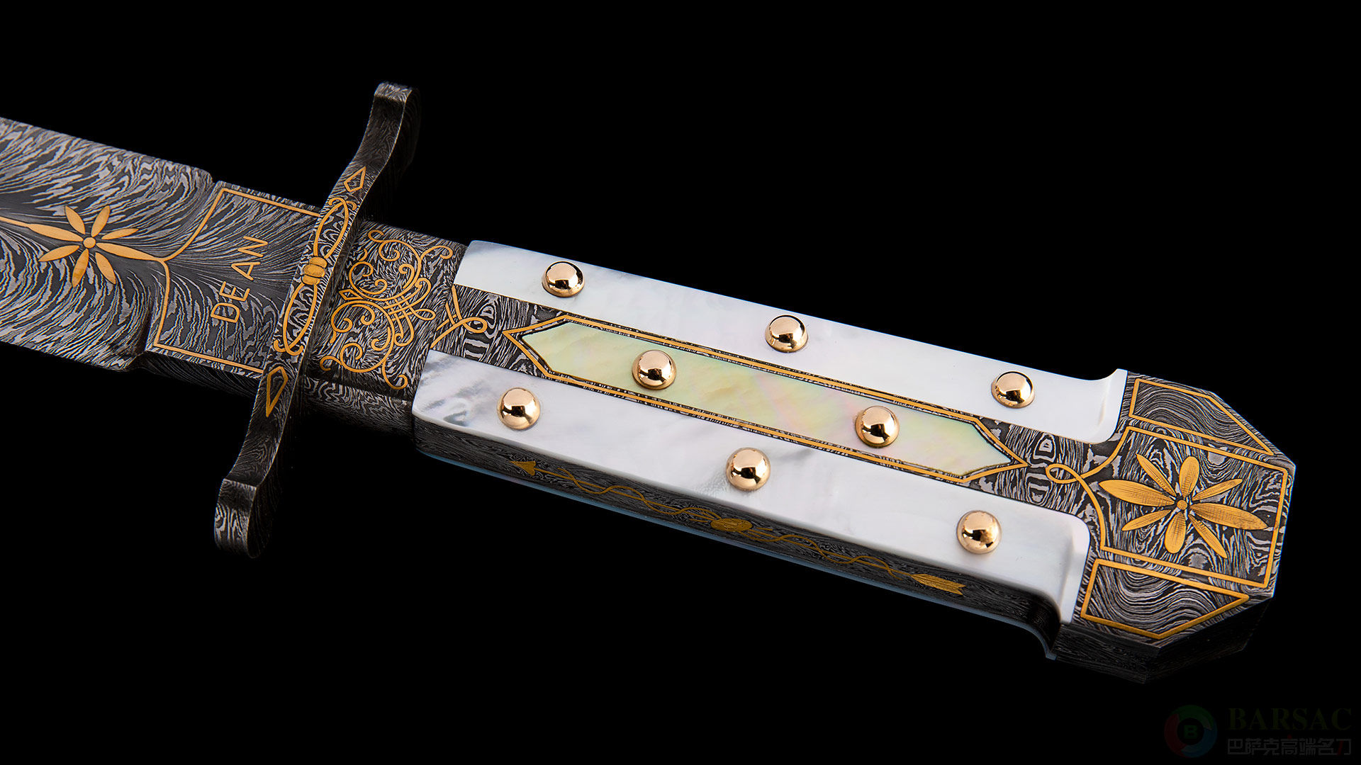 这款短剑哈维选择了潇洒的羽毛纹大马士革钢,花纹非常细腻,沿脊线向两侧舒展,一眼辨识出自大师手笔。刃底用24K金描绘LOGO和花纹并向手柄自然延伸。手柄镶嵌珍珠贝母色泽剔透,柄上的铆钉与铆钉罩都是由24K金制作而成,奢华至极。