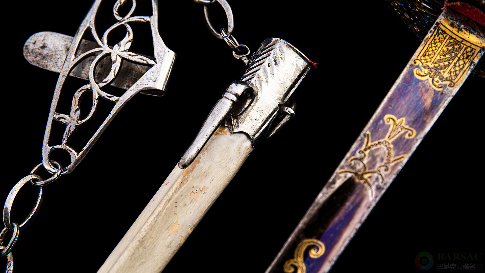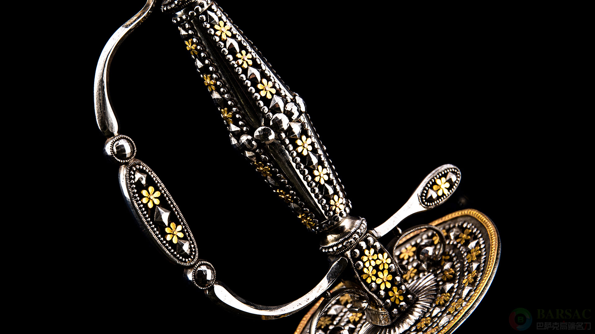 这款细剑全长100厘米左右,刃长82厘米,裸重430克。笔直修长的剑刃剑姿挺拔,横截面为三棱构造,后半段带有精美的蚀刻花纹装饰,并烤蓝镀金处理,标准的高配样式。护手到剑柄为铁质,抛光非常细腻,至今光彩照人。护手到剑柄展现了欧洲古典强大的艺术底蕴,为全镂空结构,并将上千枚大小不一的铁铆钉焊接固定在剑柄之上,每一枚铆钉表面进行了不同样式的多棱面打磨,并精美抛光,如同钻石一样,这种款式是英式击剑的一大招牌,展现出高超的工艺含量。