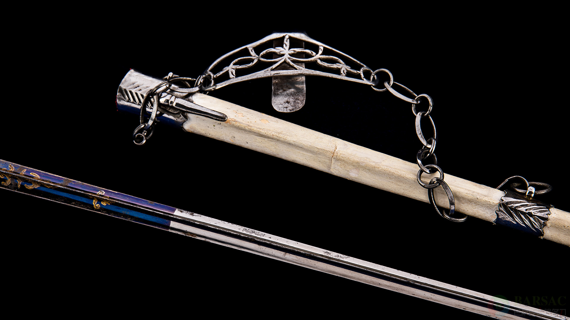 剑柄与护手之上还焊接了数十枚火金工艺制作的花朵浮雕,配合钻石金属铆钉,华丽度可谓爆表。难能可贵此件作品带有原装剑鞘,这在遗存的同一时期击剑中极为罕有。原装剑鞘采用固化羊皮纸制成,配有铁质装具,并带有镂空铁雕挂环可以挂于皮带之上。整体就年份而言,品相堪称卓越,绝对是欧洲古兵骨灰级收藏之选。
