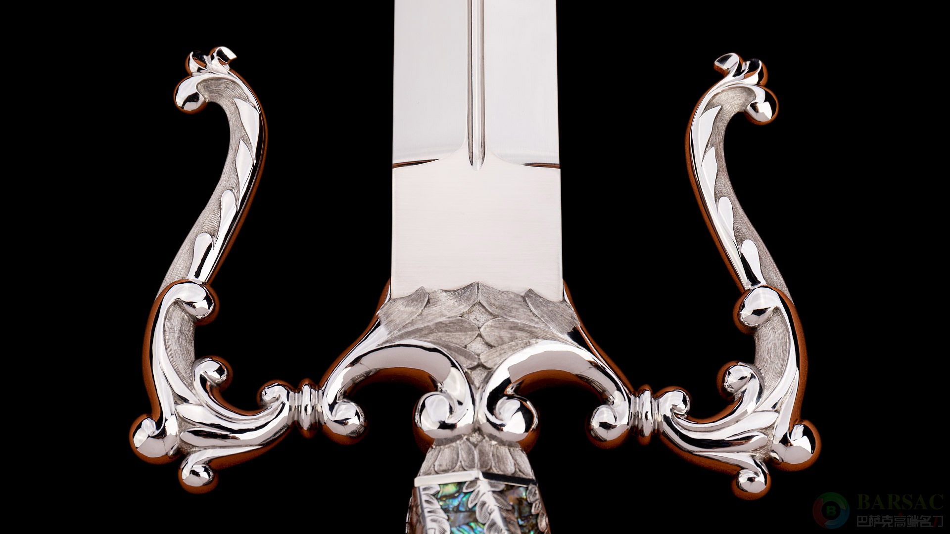 剑柄设计也非常复杂,外形轮廓为螺旋扭花形态,内里镶嵌了色彩美艳的鲍鱼壳;外围不锈钢雕刻而成的海草丝带缠绕四周,构成了如同金丝鸟笼的结构。尾铁采用不锈钢制作而成,展现了格雷出色的锉刀打磨技艺,如同羞答答的花瓣,美妙动人。整件作品从设计到选材,可谓流露着满满的大海元素,作为一位大师的炫技大作,可谓是意境与技艺的尽情绽放,不愧为海王短剑。