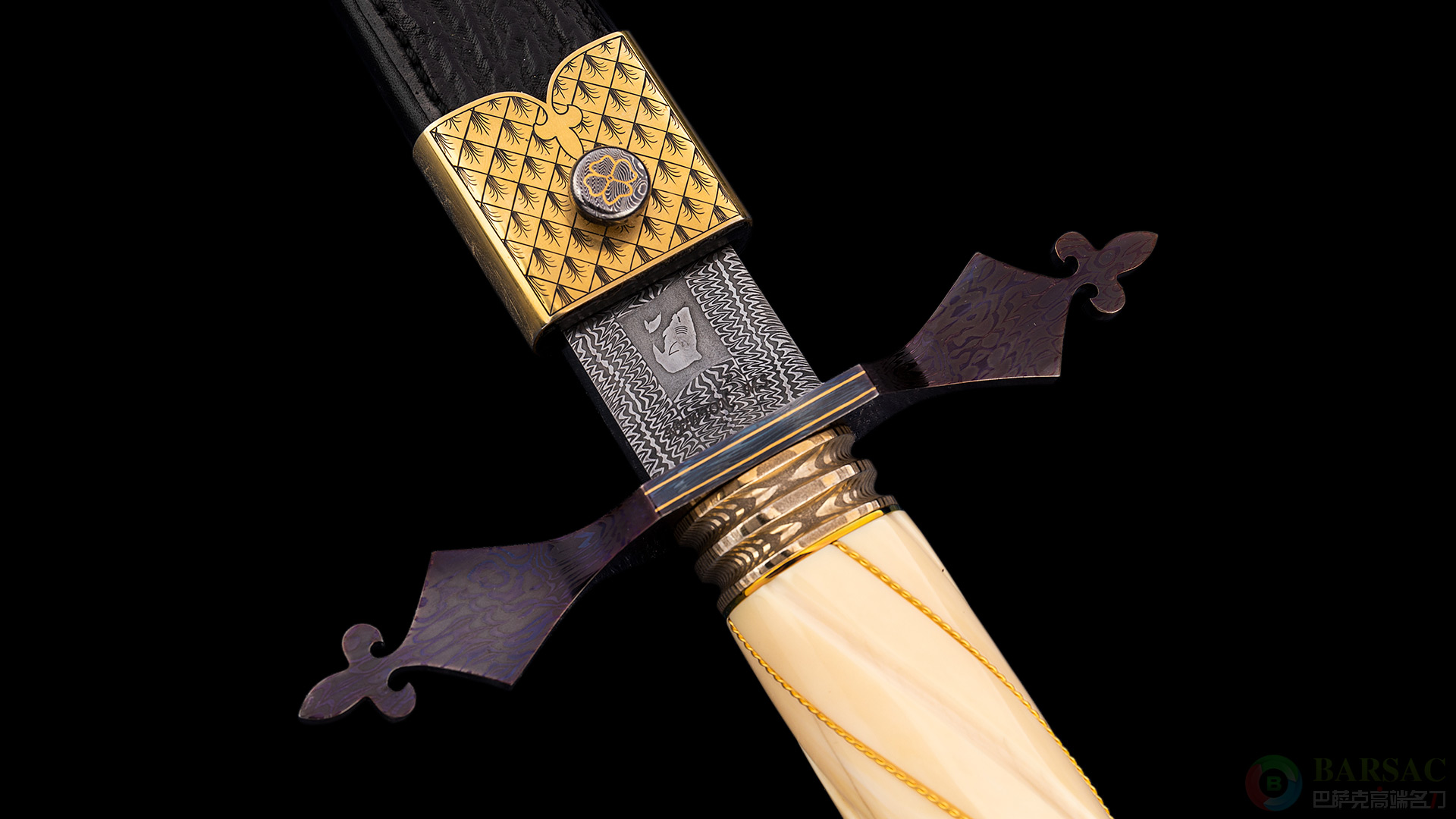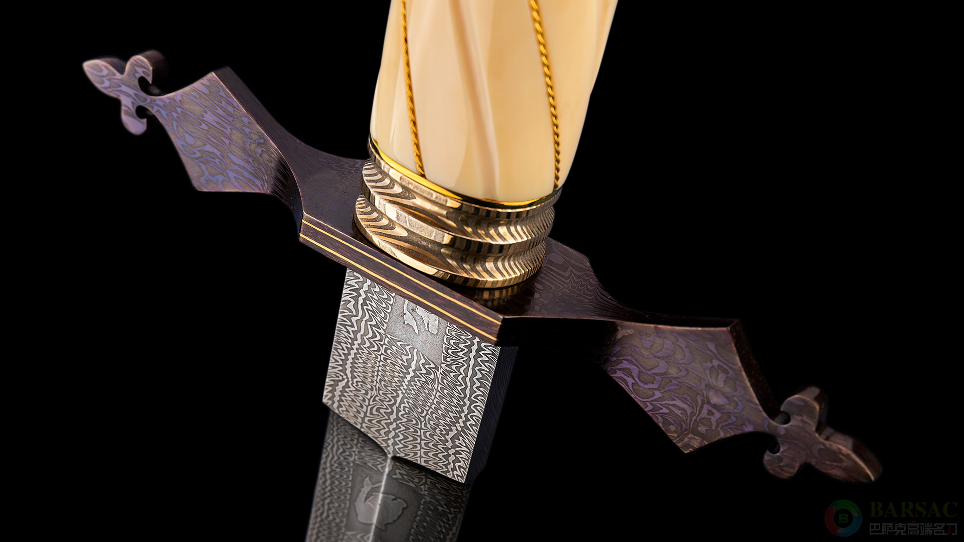 护手采用罗恩锻造大马士革制成,两端设计为墓碑造型,中部镶嵌24K黄金线条装饰,加上精美的烤蓝,色彩美艳。剑颈与尾铁采用罗恩锻造大马士革制成,柄采用黄金垫片过渡,打磨异常精美,外表再镀金,形成黄金一样的花纹质感。