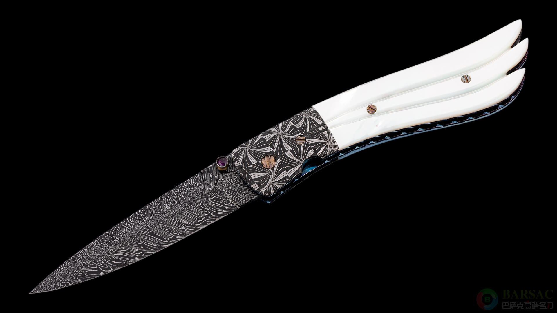 这款夏夜迷情作品刀刃采用大马士革钢制作而成,花纹热情火辣;刀刃中心脊线开槽并镶嵌五枚黄金铆钉点缀。416不锈钢框架手柄,隐藏式按钮侧跳设计,弹力威猛,展开时刀刃呼啸而出,声音清脆锁定牢固。